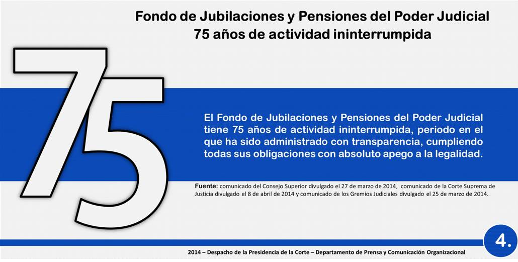 El Fondo de Jubilaciones y Pensiones del Poder Judicial tiene 75 años de actividad ininterrumpida, periodo en el que ha sido administrado con transparencia, cumpliendo todas sus obligaciones con absoluto apego a la legalidad.